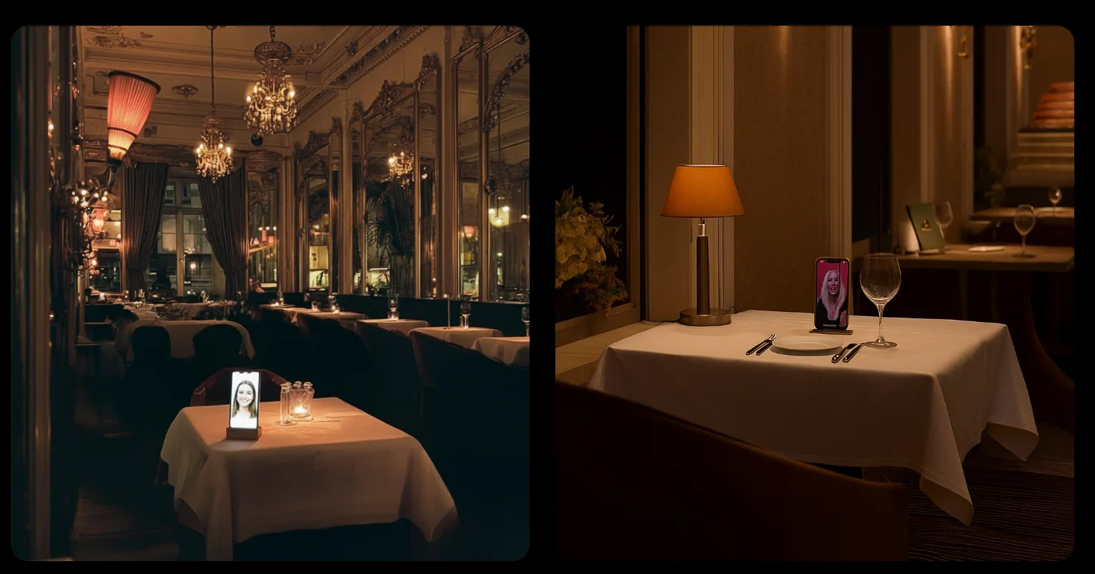 Амбиентот е уреден да потсетува на класично романтично излегување: придушено осветлување, масички за една личност и специјални држачи за мобилни телефони, каде што „седнува“ вашиот дигитален партнер додека пиете, грицкате и разговарате.