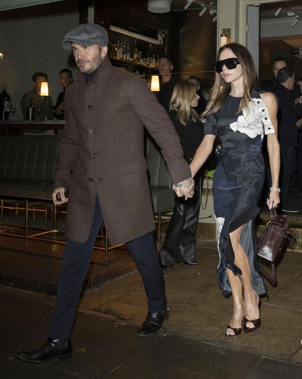 Овој фустан Викторија го искомбинирала со кафеави чевли на висока потпетица кои одлично ги вклопила со кафеавата чанта со средна големина.
