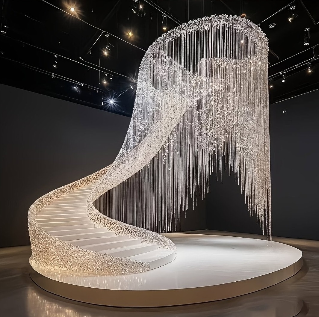 На Инстаграм се појави спонзорирана објава која привлече глобално внимание. Фотографијата прикажува огромни спирални скали од сребрено стакло, украсени со кристални нишки и сјајни детали. Делува како луксузна, речиси футуристичка инсталација.