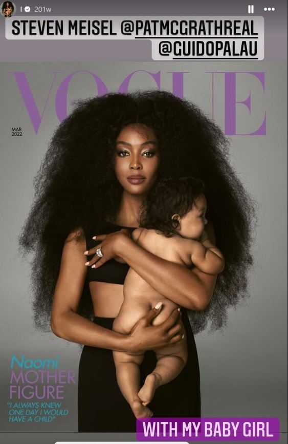 Во мај 2021 година, Наоми на „Инстаграм“ објави дека за првпат стана мајка. Лицето на своето бебе го откри дури во февруари наредната година, со впечатлива фотографија на насловната страница на британскиот „Vogue“ во март.