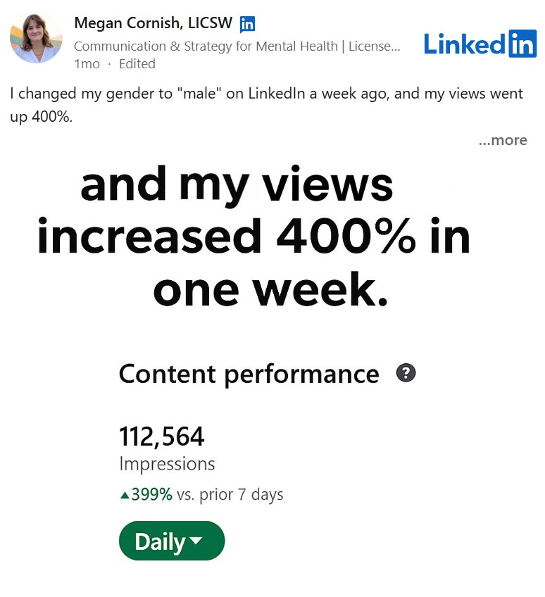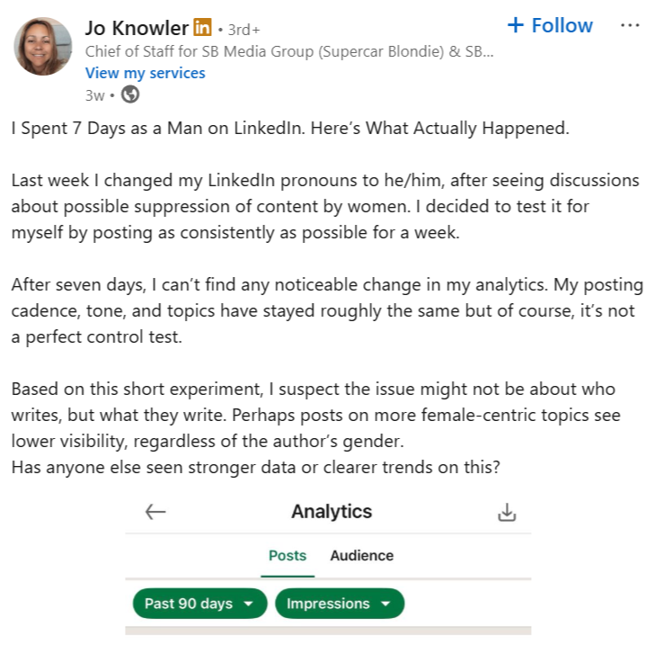 „Минатата недела ги сменив моите „LinkedIn“ заменки во „тој/негов“, откако ги видов дискусиите за можно потиснување на содржината од жени. Одлучив сама да го тестирам тоа, објавувајќи колку што е можно подоследно во текот на една недела“, напиша Џо.