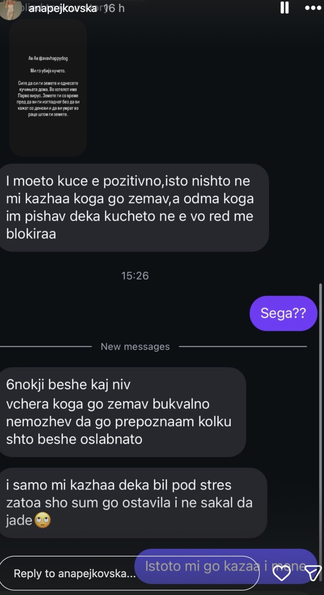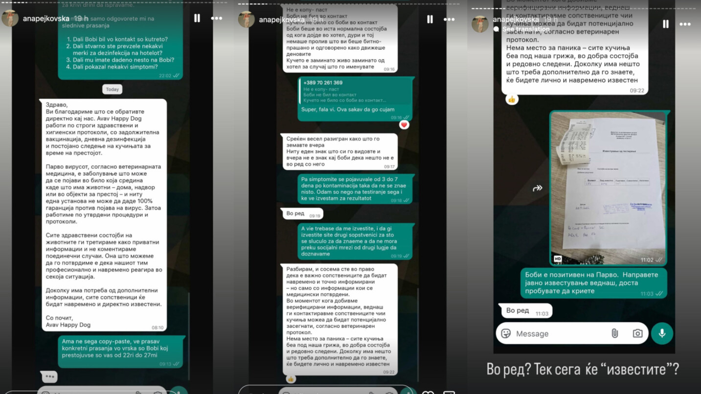 Во уште едно сведоштво, објавено анонимно, а споделено од Пејковска, сопственик наведува дека неговото куче по шест ноќи престој во пансионот било вратено значително ослабено, а подоцна било дијагностицирано со парвовироза. „Ми беше кажано дека е под стрес и дека затоа не јадело“, стои во објавениот принт-скрин.