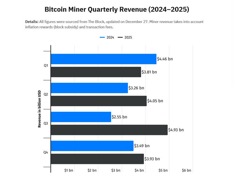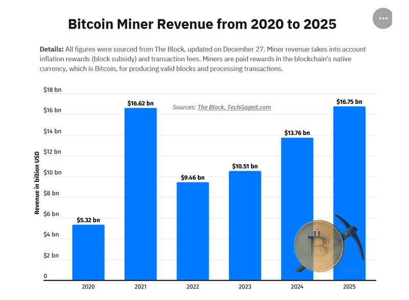 И покрај падот на цената на биткоин и зголемената волатилност на пазарот на криптовалути, 2025 година завршува како најуспешна досега за рударите на биткоин. Според податоците на „TechGaged“, вкупните приходи на рударите до крајот на декември достигнале рекордни 16,75 милијарди долари, што е речиси за 3 милијарди повеќе од 2024 година и за 130 милиони долари над досегашниот рекорд од 2021 година.