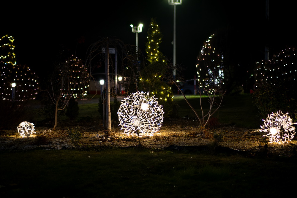 Новогодишната декорација е поставена на надворешниот дел од зелената површина пред објектот, што овозможува сите кои се движат во овој дел – пеш или со возило – да уживаат во визуелниот ефект и празничната атмосфера. Големите дрвја се украсени со сијалички во низа, кои создаваат елегантна светлосна линија, додека помалите дрвја се осветлени со мрежа од сијалички, внимателно вклопени во просторот без да се наруши природниот изглед на зеленилото.