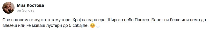 Миа Костова напиша: „Се поголема е журката таму горе. Крај на една ера. Широко небо Панкер. Балет си беше или нема да влезеш или ќе маваш лустери до 5 сабајле“.