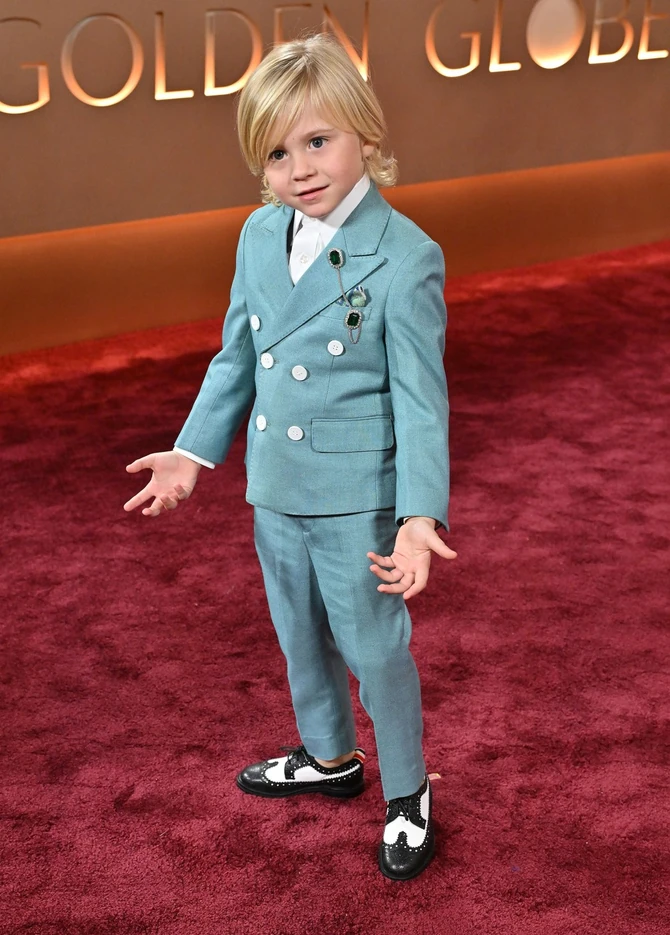 Дјук Меклауд, шестгодишниот актер кој во серијата „All Her Fault“ игра една од забележителните улоги, се појави на црвениот тепих во совршено скроено сино одело. Со елегантни црно-бели чевли, мало џебно марамче, брош и смарагден украс на реверот, Дјук изгледаше како да се симнал директно од модна писта, а не од снимање серија.