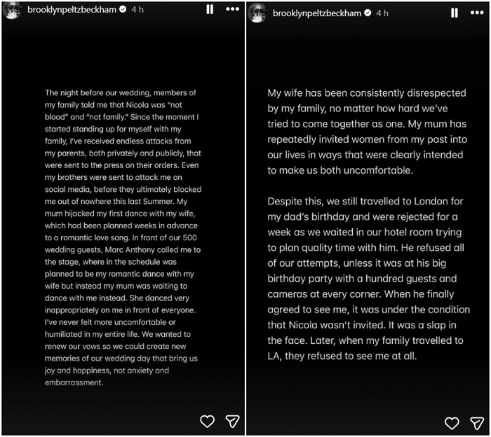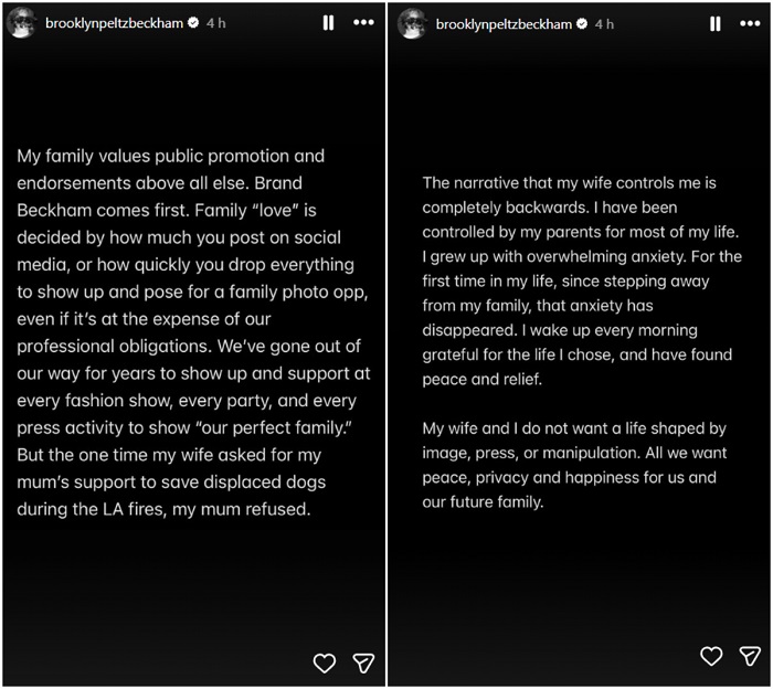 Бруклин Бекам конечно одлучи да ја отвори душата и да стави крај на шпекулациите за војната што веќе подолго време тлее меѓу него, неговата сопруга Никола Пелц и славните родители Дејвид и Викторија. Преку серија објави на Инстаграм, Бруклин ги обвини родителите дека постојано се обидуваат да му ја уништат врската само за да добијат повеќе публицитет во медиумите.