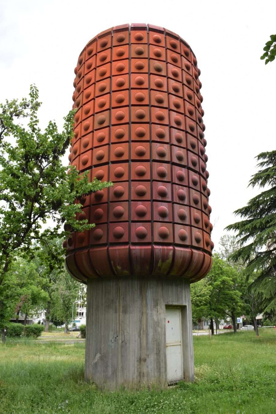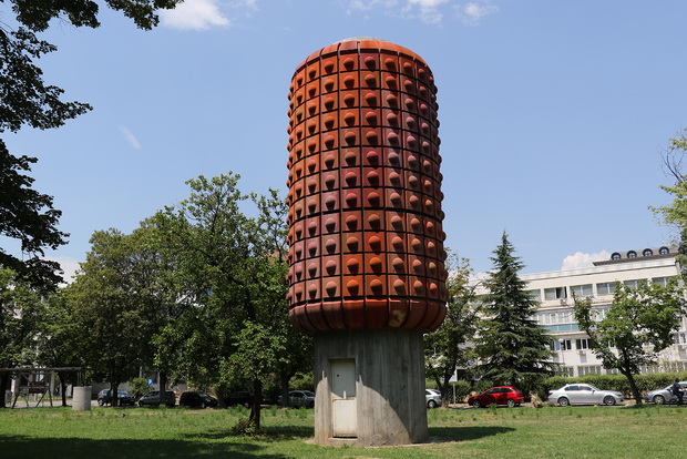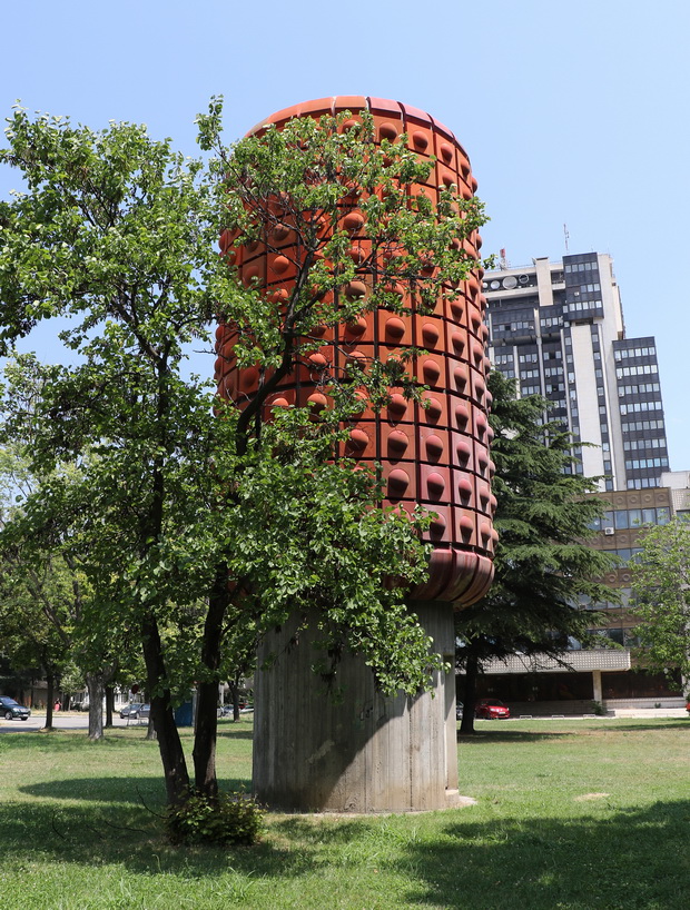 Тоа е споменикот „Бомба“ — скулптура сместена во паркот пред Националната радио телевизија, во непосредна близина на Младинскиот културен центар (МКЦ), чии автори се Александар Никољски и Владимир Пота. Иако на прв поглед делува како апстрактна скулптура, овој споменик е директно поврзан со една од најзначајните и најтајни партизански активности за време на Втората светска војна.