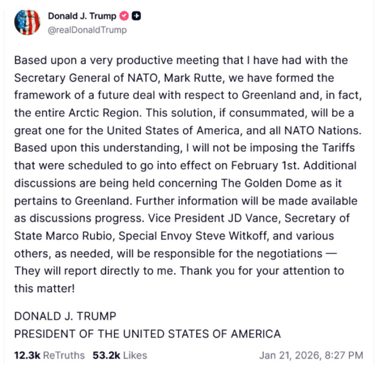 Трамп го објави договорот на социјалната мрежа Truth Social по средбата со генералниот секретар на НАТО, Марк Руте, во Давос, каде што се одржуваше Светскиот економски форум. Тој напиша дека тој и Руте „ја формирале рамката на иден договор во врска со Гренланд и, всушност, целиот арктички регион“, без да даде детали. Додаде дека таквото решение, доколку се спроведе, би било „одлично за САД и сите земји од НАТО“.