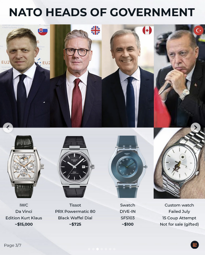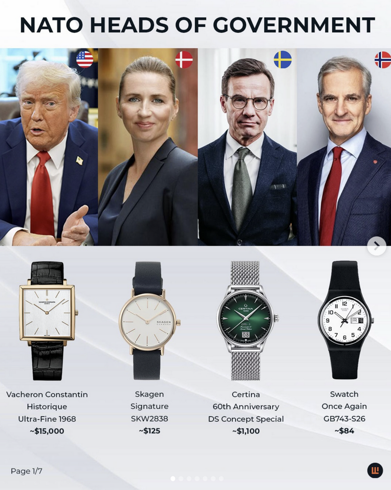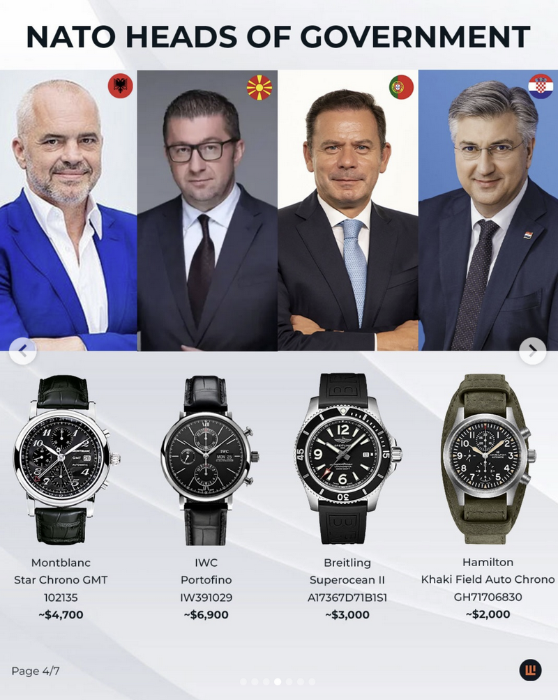 Во истото истражување, IFLW наведува дека изборите на часовници кај НАТО лидерите значително варираат – од луксузни брендови како Vacheron Constantin и Montblanc, до попристапни и практични модели од Tissot, Hamilton и Skagen. Токму тоа, според порталот, покажува дека часовникот е личен избор, а не само симбол на статус.