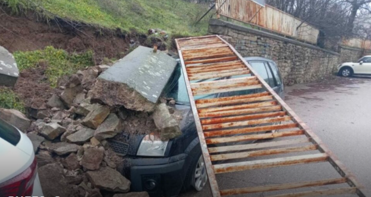 [ВИДЕО/ФОТО] Се урна потпорен ѕид на штипската клиничка болница, оштетени неколку автомобили