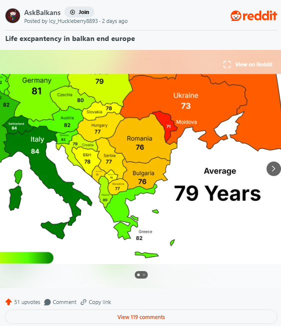 На популарната социјална мрежа „Reddit“ е објавена нова мапа на Европа со податоци за очекуваниот животен век. Постојат јасни разлики меѓу земјите, но и во рамките на самите региони, што покренува прашања за квалитетот на здравствената заштита, животните навики и социоекономските разлики.