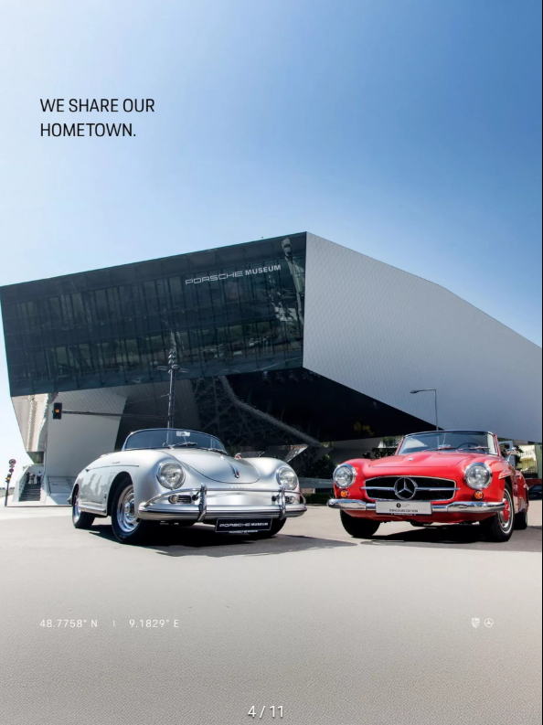 „Дури го делиме и легендарниот E 500“ (кој беше развиен и произведен во соработка со „Porsche“). „Но, најважно од сè, ја споделуваме истата верба: дека автомобилите не се тука само да го движат нашето тело, туку и нашето срце. За 140 години автомобилска историја и за уште многу заеднички моменти.“