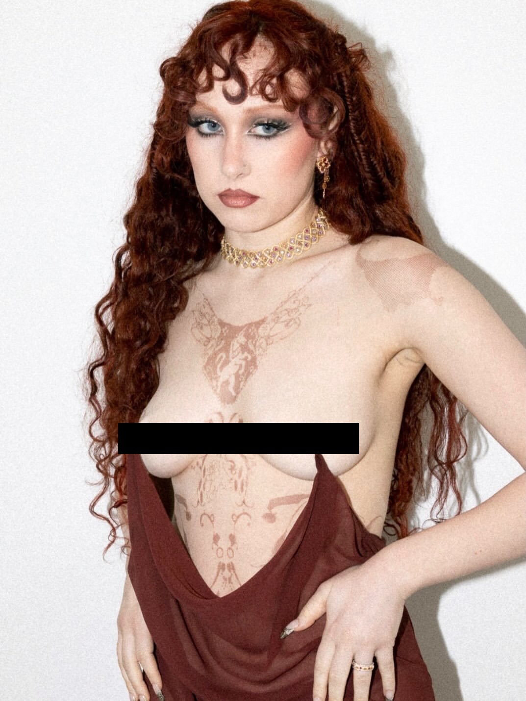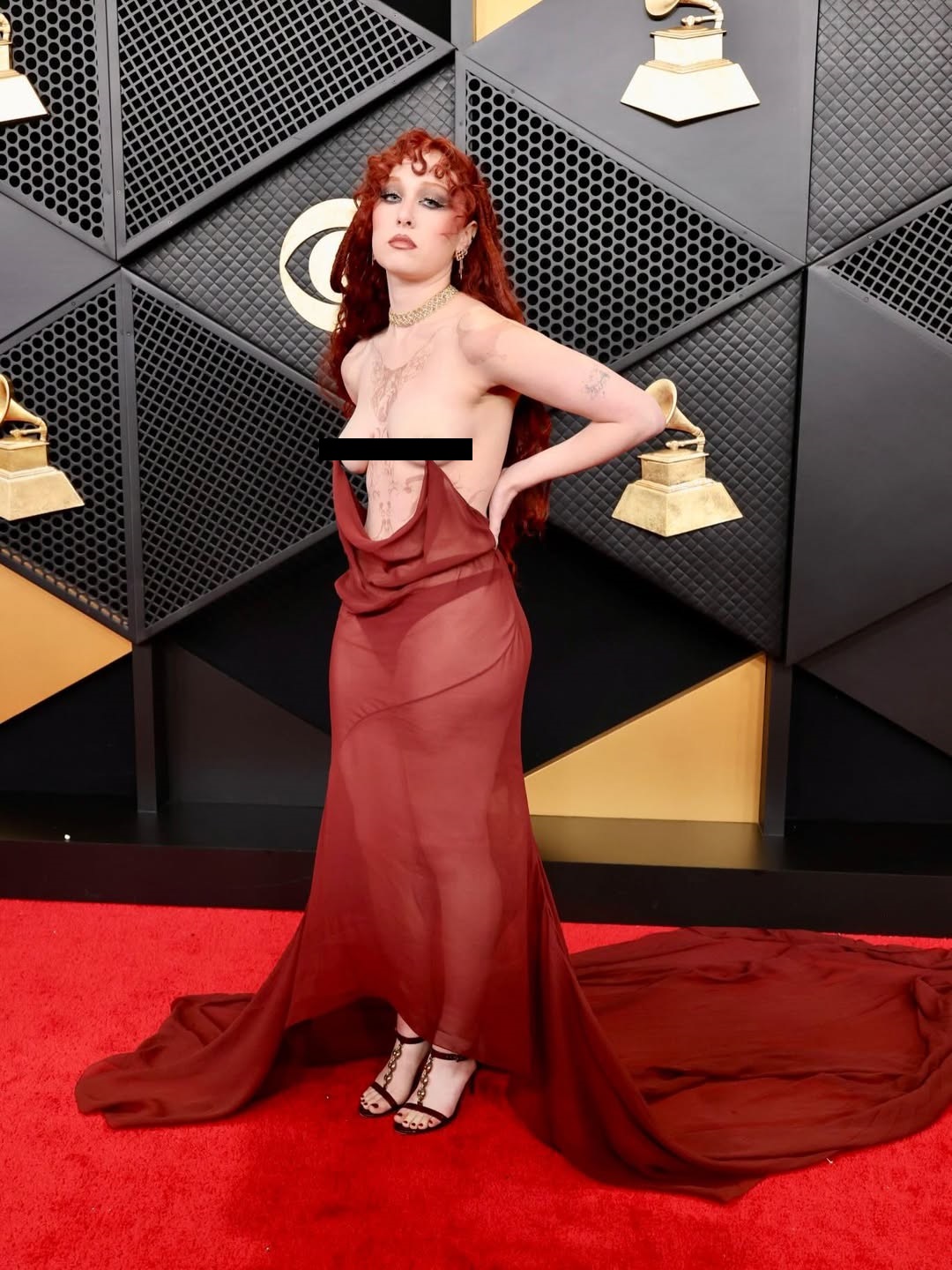 Имено, 27-годишната ѕвезда се појави на доделувањето на наградите во фустан прицврстен со прстени на брадавиците, додека од тој дел кон подот се спушташе проѕирна бордо ткаенина.