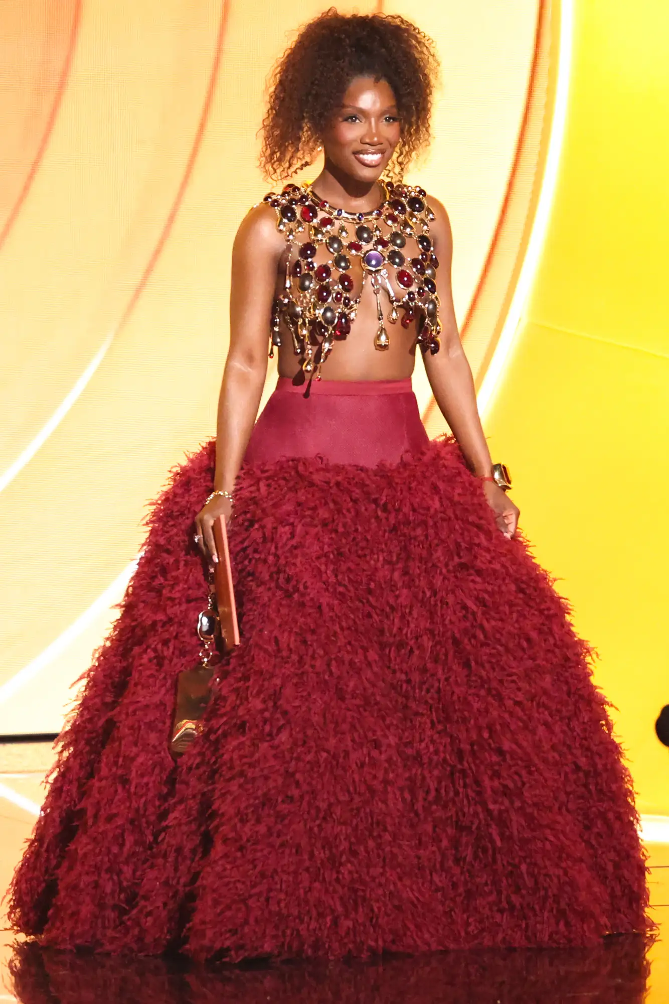 Горниот дел од нејзината комбинација беше златен ѓердан со внимателно распоредени разнобојни скапоцени камења кои се спуштаа по нејзините гради. Овој провокативен моден елемент, авторката на хитот „Anxiety“ го искомбинира со раскошно балско здолниште во боја на роза, со сатенски спуштен струк, покриено со лелеави перја. Изгледот го надополни со голема златна нараквица и соодветна чанта.