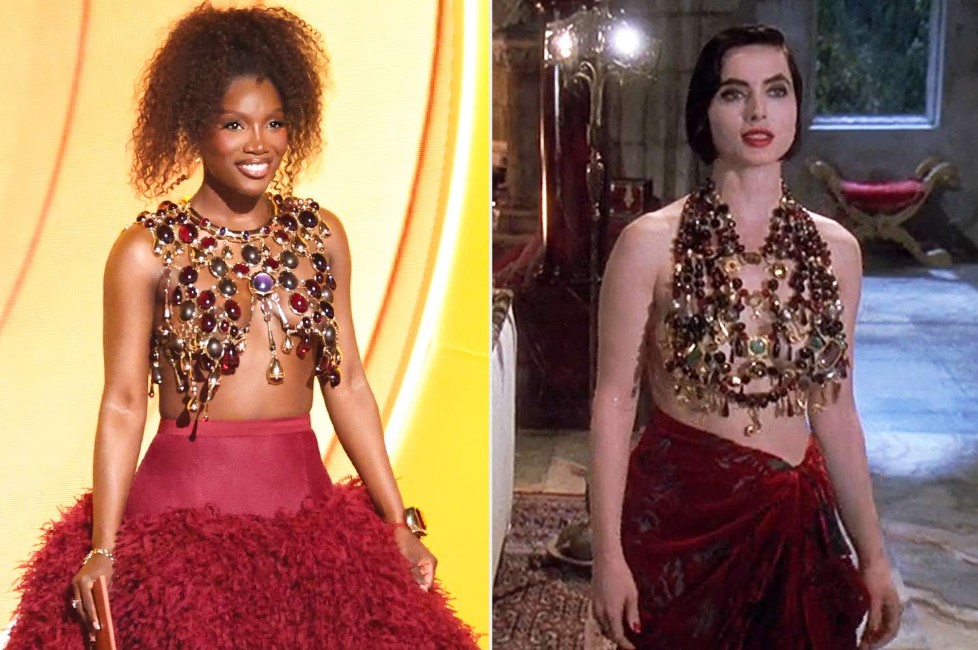 На сцената се појави во комбинација составена исклучиво од накит наместо топ и раскошно црвено балско здолниште, со што оддаде почит на култната сцена од филмот „Death Becomes Her“. Овој изглед веднаш го привлече вниманието на модните познавачи, а Доечи го интерпретираше на целосно автентичен начин, пишува „InStyle“.