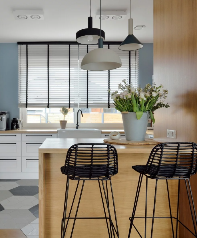 Отворените концепти и кујнски острови продолжуваат да доминираат, но со акцент на удобност. Високите барски столчиња се заменуваат со удобни столици, а кујнскиот остров сѐ почесто има функција на маса за јадење, за работа или дружење. Кујната така природно се поврзува со дневната соба, бришејќи ги границите меѓу кујна и заедничко поминато време.