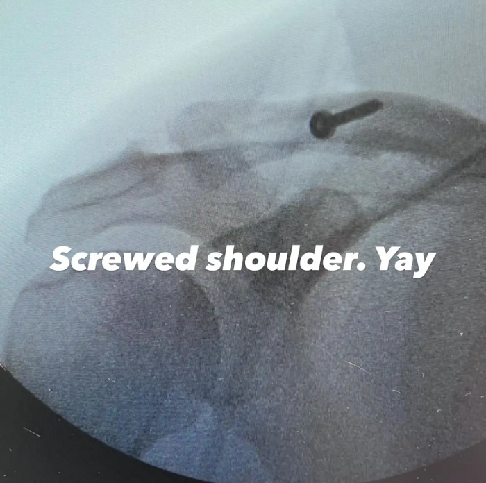 Во следната објава, по операцијата, сподели нова рендгенска снимка на која се гледа голем штраф што ги држи коските заедно.
