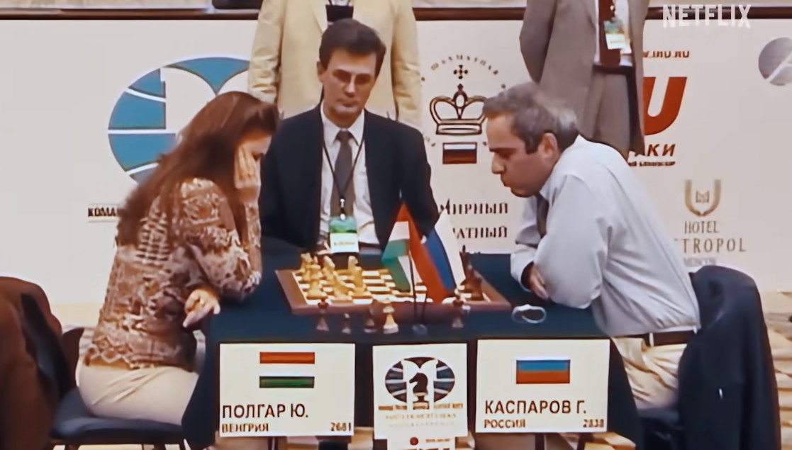Документарецот детално го обработува и историскиот шаховски меч од 1994 година меѓу Полгар и рускиот велемајстор Гари Каспаров. Таа средба била прва можност на светско ниво највисоко рангираната шахистка во светот да се соочи со својот машки колега на врвот на листата.