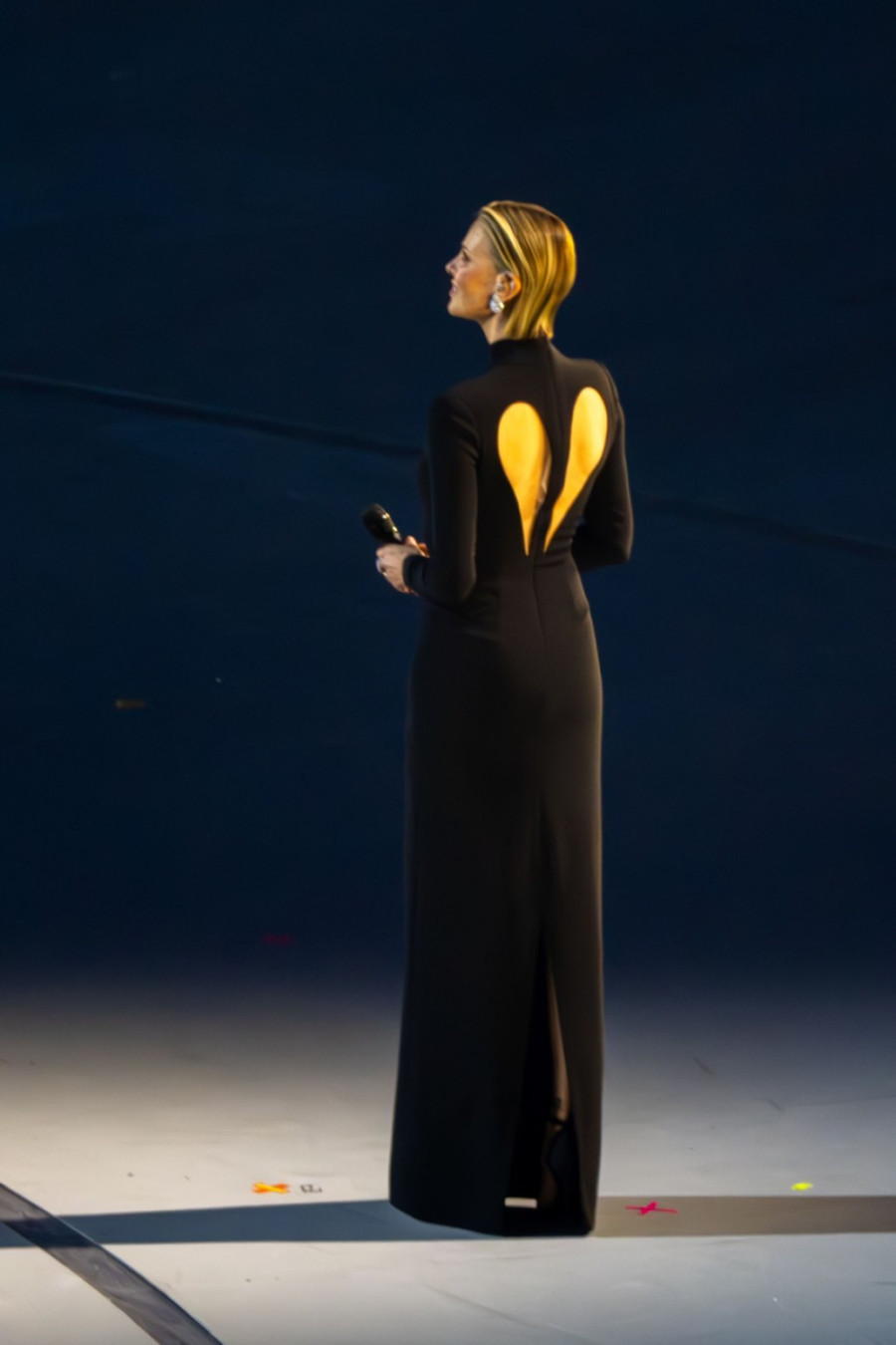 За оваа пригода избра долг црн фустан со долги ракави, со два специфични отвори во пределот на градите кои формираа форма на срце. Стајлингот го заокружи со обетки и прстени украсени со впечатливи скапоцени камења и елегантни сандали со тенки ремчиња.