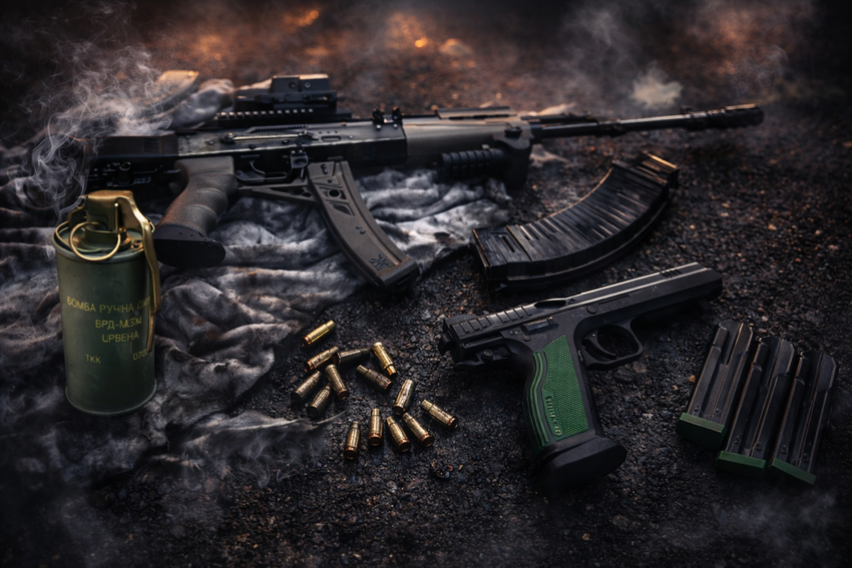 При претресите биле пронајдени и одземени автоматска пушка со две рамки и 44 куршуми, два пиштола со три рамки и 14 куршуми, една ловна пушка, една воздушна пушка, една рачна димна бомба, како и поголемо количество муниција од различен вид и калибар, заедно со други предмети кои ќе бидат користени како доказ во натамошната постапка.