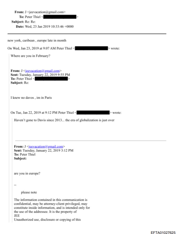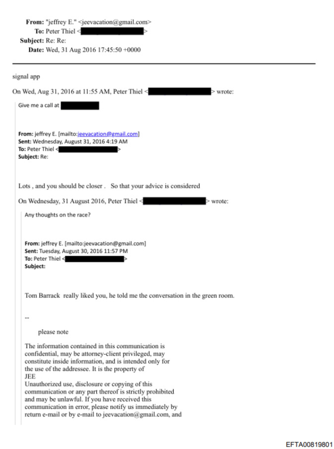 Е-поштата потврдува дека се сретнале, а преписката вклучува состаноци за планирање, дискутирање за кампањата на Трамп и неформални пораки, при што тимот на Тил пред еден состанок му ги испратил и неговите преференциите за храна до персоналот на Епштајн.