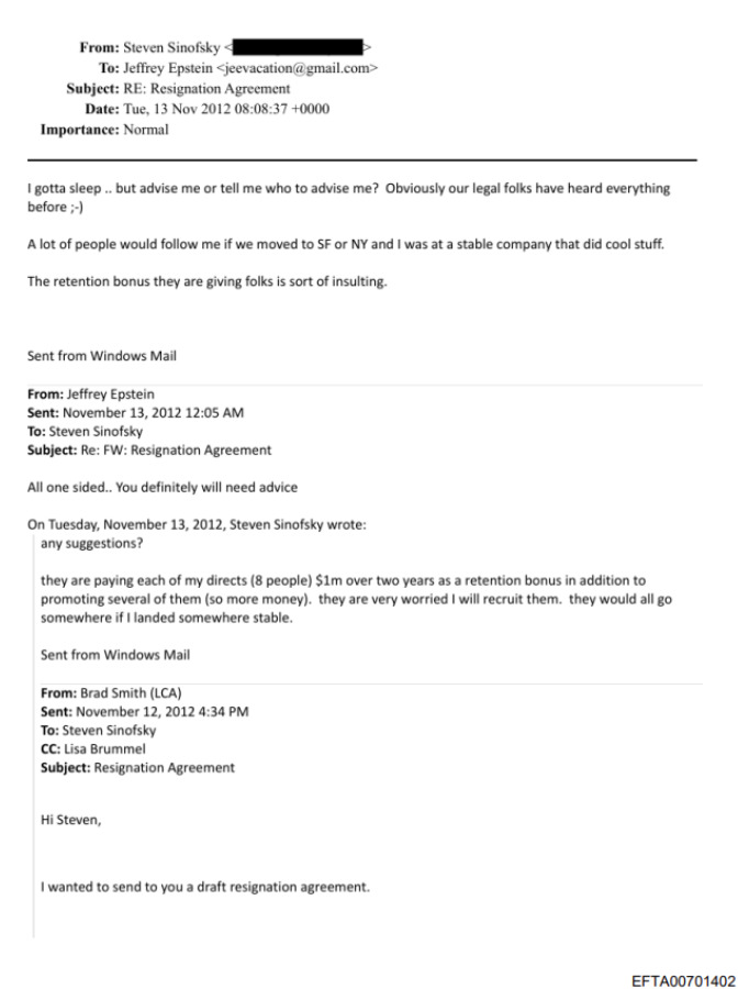 Новите поднесоци откриваат и повеќе детали за односот помеѓу Епстин и Стивен Синофски, поранешен извршен директор на Мајкрософт одговорен за клучни производи како што се Windows и Office. Документите покажуваат дека Синофски побарал совет од Епстин за условите за неговото заминување од Мајкрософт во 2012 година.