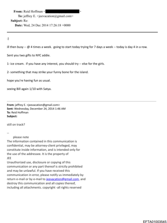 Во документите често се споменува и Рид Хофман, коосновач на LinkedIn, а преписката покажува пријателска размена на е-пошта. Иако голем дел од преписката се фокусираше на собирање средства за Media Lab на МИТ, таа исто така вклучуваше лични интеракции, даночни совети, закажување состаноци и споменувања за подароци што Хофман му ги испратил на Епстин.