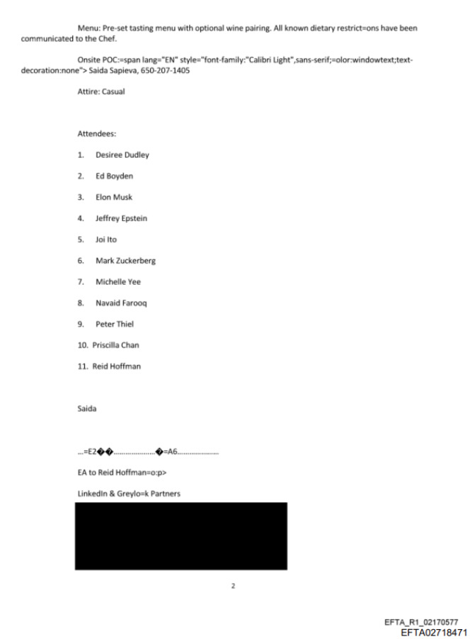 Е-пошта од 2015 година споменува вечера што Хофман ја организирал во Пало Алто, на која присуствувале Марк Цукерберг, Илон Маск, Питер Тил и научникот од МИТ, Ед Бојден. Хофман потоа ги поврзал Цукерберг и Епстин преку е-пошта.