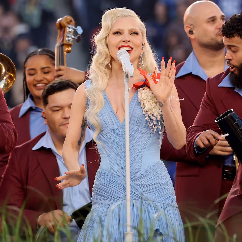 Гага се појавила во син елегантен фустан, со кој ѝ оддала почит на латиноамериканската култура. Зад креацијата на брендот „Луар“, стои доминиканско-американскиот дизајнер Раул Лопез. Станува збор за фустан во нежна, сина боја кој е скроен за да ја следи силуетата на телото.