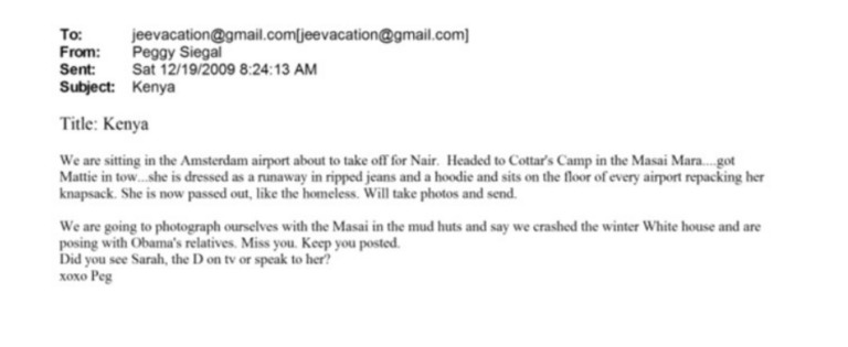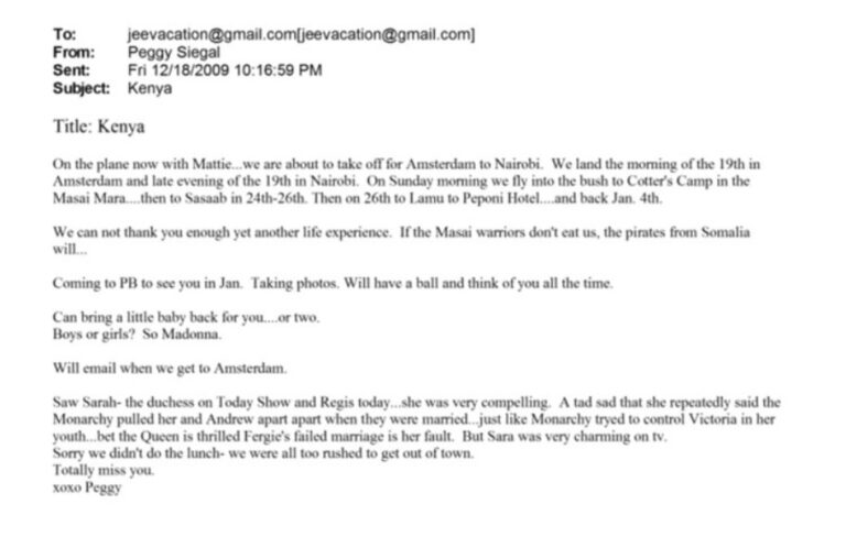 Во преписка од 2009 година за патување во Кенија се содржи понуда да „му донесете мало бебе… или две. Момчиња или девојчиња? Исто како Мадона“.
