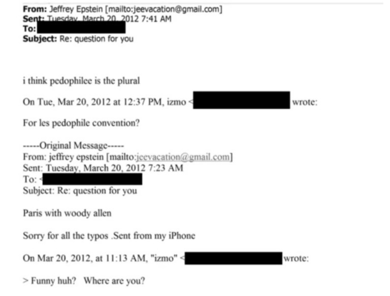 Во е-пошта од 2012 година, Епстин се шегува за патувањето во Париз со Вуди Ален, неговиот сосед од Њујорк, кој е споменат повеќе од 7.000 пати во досиејата.