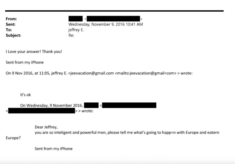 Во е-пошта испратена еден ден откако Трамп победи на претседателските избори во 2016 година, испраќачот, користејќи скриен идентитет, пишува: „Драг Џефри, ти си толку интелигентен и моќен човек, те молам кажи ми што ќе се случи со Европа и Источна Европа?“ Епстин веднаш одговара: „Ќе биде во ред“.