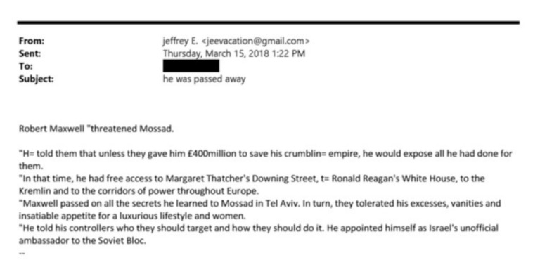 Во е-пошта испратена на 15 март 2018 година до анонимен примач, со наслов „почина“, Епстин шпекулира за судбината на таткото на Гислејн Максвел, Роберт Максвел.