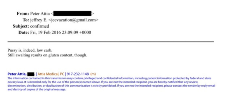Питер Атија, гуру за долговечност на познати личности и нов соработник на Бари Вајс од CBS News, се појавува неколку пати во досиејата, вклучително и во преписката што навлегува во гротескни дискусии за сексуални теми.