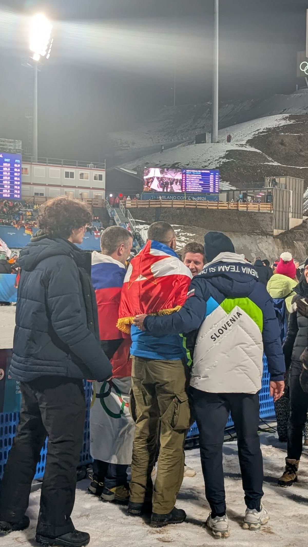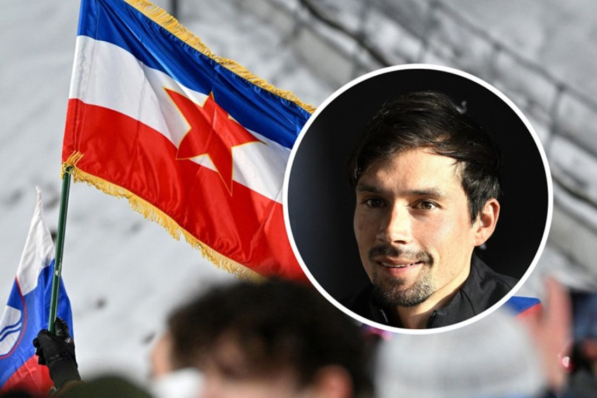 На натпреварувањето во скијачки скокови на овогодишните Зимски олимписки игри словенечкиот велосипедист Примож Роглич се фотографирал со навивач кој го носел знамето на поранешна Југославија.