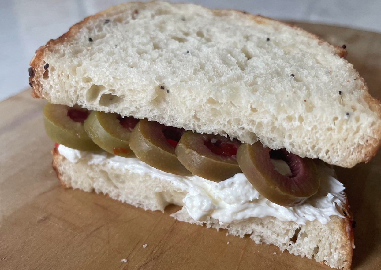 Ставете сечкани маслинки врз лебот и затворете го сендвичот. Пресечете го на половина и послужете.