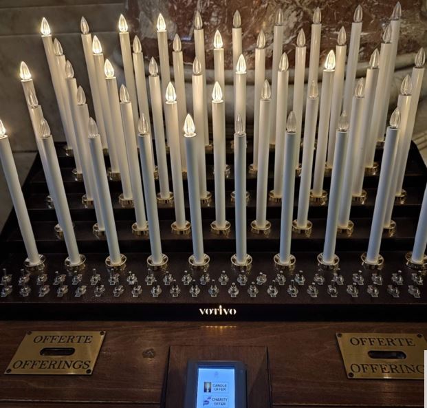 Сепак, еден детаљ целосно ме затекна. Наместо класичните восочни свеќи, здогледав електронски свеќи. До нив има мало сандаче во кое се ставаат пари, а потоа со притискање на копче се пали светлината – симбол на молитвата.
