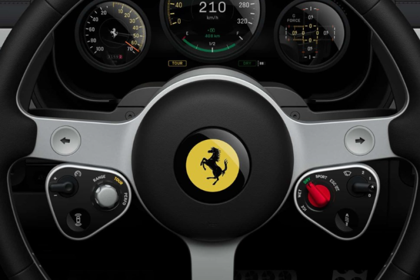 На воланот има физички команди за темпомат, избор на режим на возење, контрола на пролизгување, бришачи и адаптирање на суспензијата. „Ferrari“ наведува дека е 400 грама полесен од воланите во другите модели на компанијата.