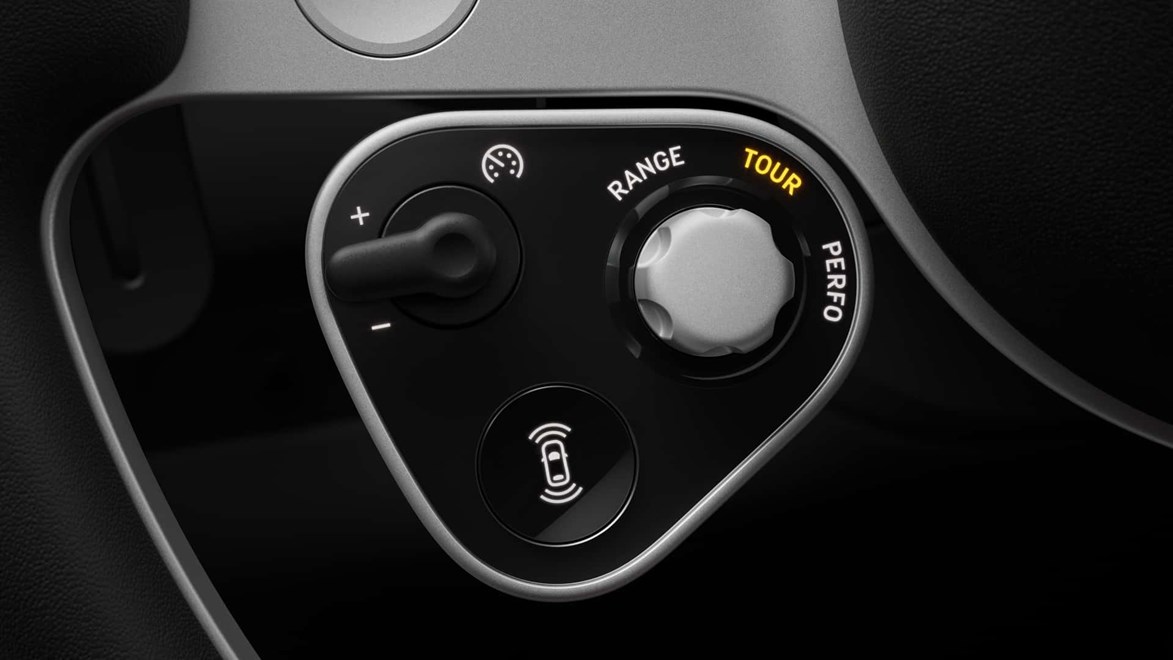 Екранот е прицврстен за столбот на воланот, што значи дека се движи заедно со воланот. Самиот волан е интерпретација на класичните трикраки дрвени волани „Nardi“ од 1950-тите и 1960-тите, со тенок обрач и видливи алуминиумски краци. Алуминиумот е еден од доминантните материјали во целата кабина.
