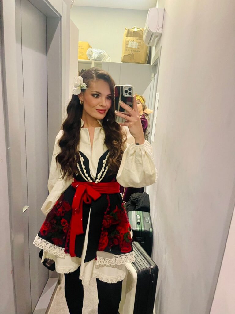 Во финалната вечер Моника прошета во стилизирана македонска носија, а потоа и во долг фустан во впечатливо сино-зелена нијанса.