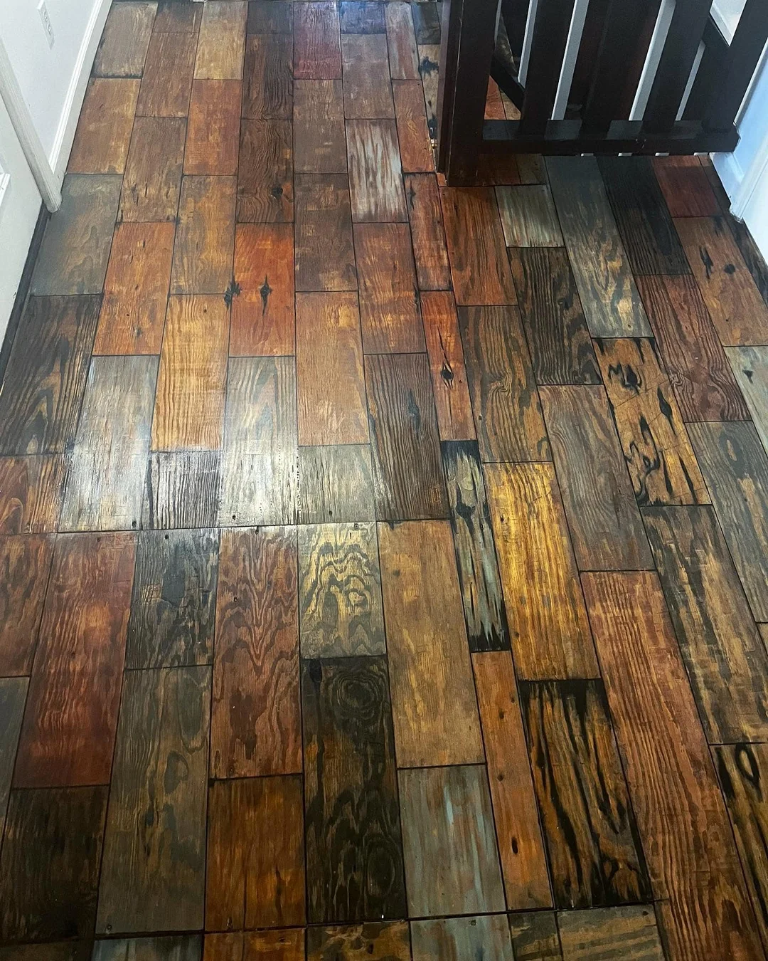 Подот, кој на почетокот бил обична шперплоча, го претворила во површина што многу уверливо имитира темни дрвени штици.