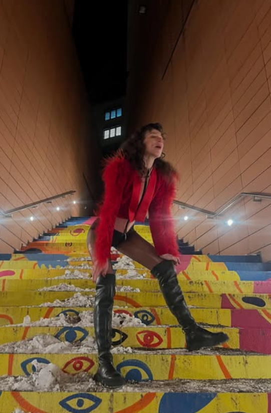 Актерката блеска во смела креација на македонскиот дизајнер Марков – боди со стилизирано црвено палто и високи чизми до над колена, па се чини дека снегот во Берлин не бил пречка таа да прошета облечена во таква креација.