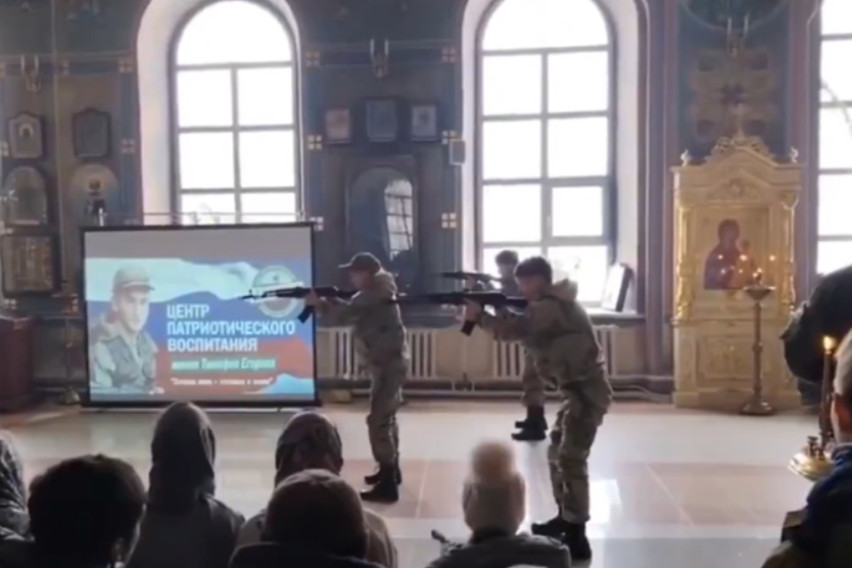 На социјалните мрежи циркулира видео од Русија на кое се гледа група униформирани малолетници како ракуваат со автоматско оружје во православна црква.