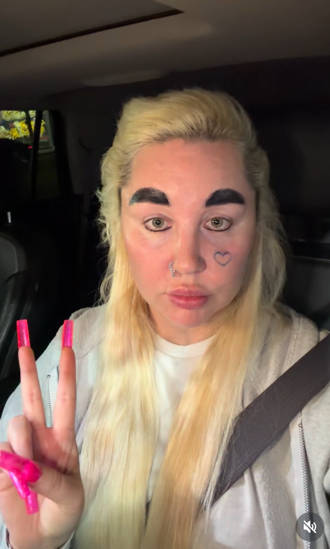 Во новото видео, Аманда позира во автомобил и гордо ги покажува тетоважите со срце на лицето, нагласените и зголемени веѓи, избелено русата коса и флуоресцентни розови вештачки нокти.