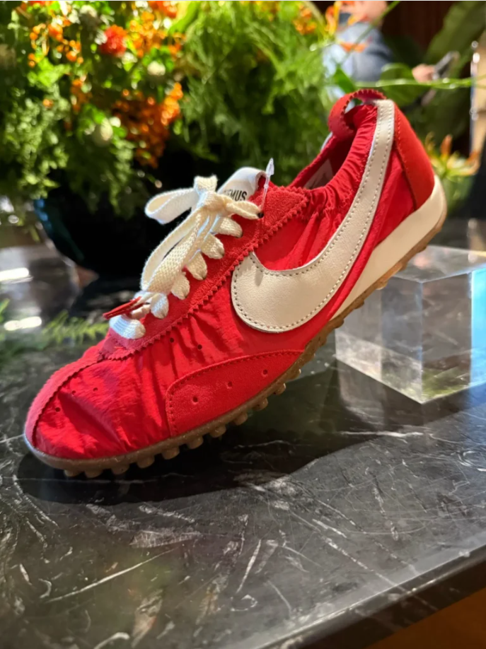„Moon Shoe“ патиките го комбинираат тркачкото потекло на оригиналниот модел со модерната балетска естетика, создавајќи современа, ниска „торпедо“ патика која ја отсликува едноставноста на париската дизајнерска филозофија на Жакемус и динамичноста на спортското наследство на брендот „Nike“.