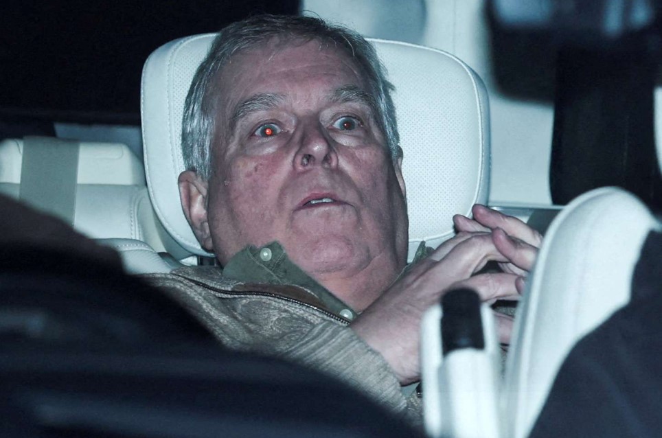 На неа се гледа Ендру, подгрбавен на задното седиште во „Range Rover“, откако поминал 11 часа во полициски притвор во Полициската станица Ајлшем. Под сликата стои опис: „Сега се препотува“.