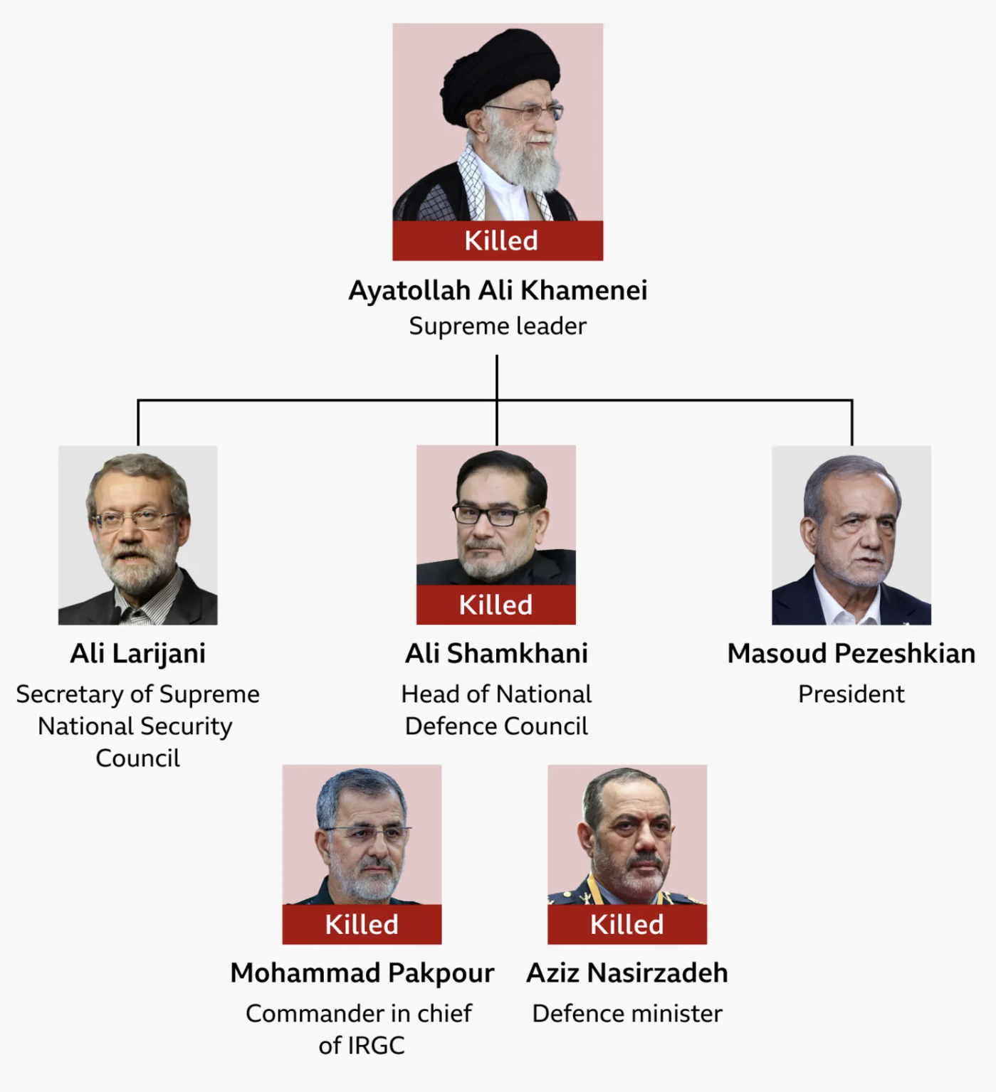 Израелските одбранбени сили (ИДФ) именуваа седум високи ирански одбранбени функционери меѓу убиените, вклучувајќи го секретарот на иранскиот Совет за одбрана Али Шамкани, министерот за одбрана, бригаден генерал Азиз Насирзаде и командантот на ИРГК, генерал Мохамед Пакпур.