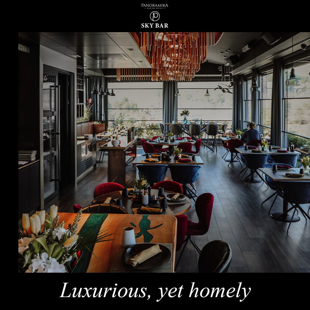 Во склоп на дизајн хотелот „Панорамика“, се наоѓа Sky Bar-от – вашето ново омилено место кое ќе ви ги истакне убавините на градот, притоа овозможувајќи ви врвно гостинско искуство придружено со одлична храна и пијалаци по ваш избор. Низ стаклените ѕидови ќе ја видите панорамата на главниот град, а она што ќе ве пречека во внатрешноста ќе направи да се чувствувате како да сте ѕвездата на шоуто.