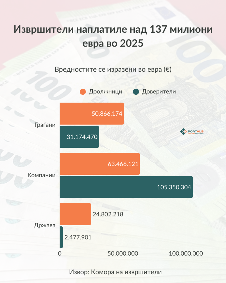 Анализа на „Порталб“: Извршителите во 2025 присилно наплатиле над 137 милиони евра, најголемата сума од речиси 70.000.000 евра наплатена во Скопје